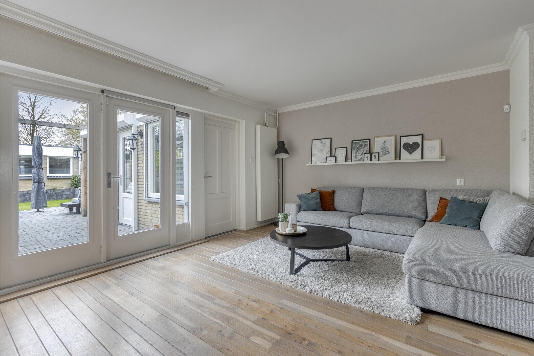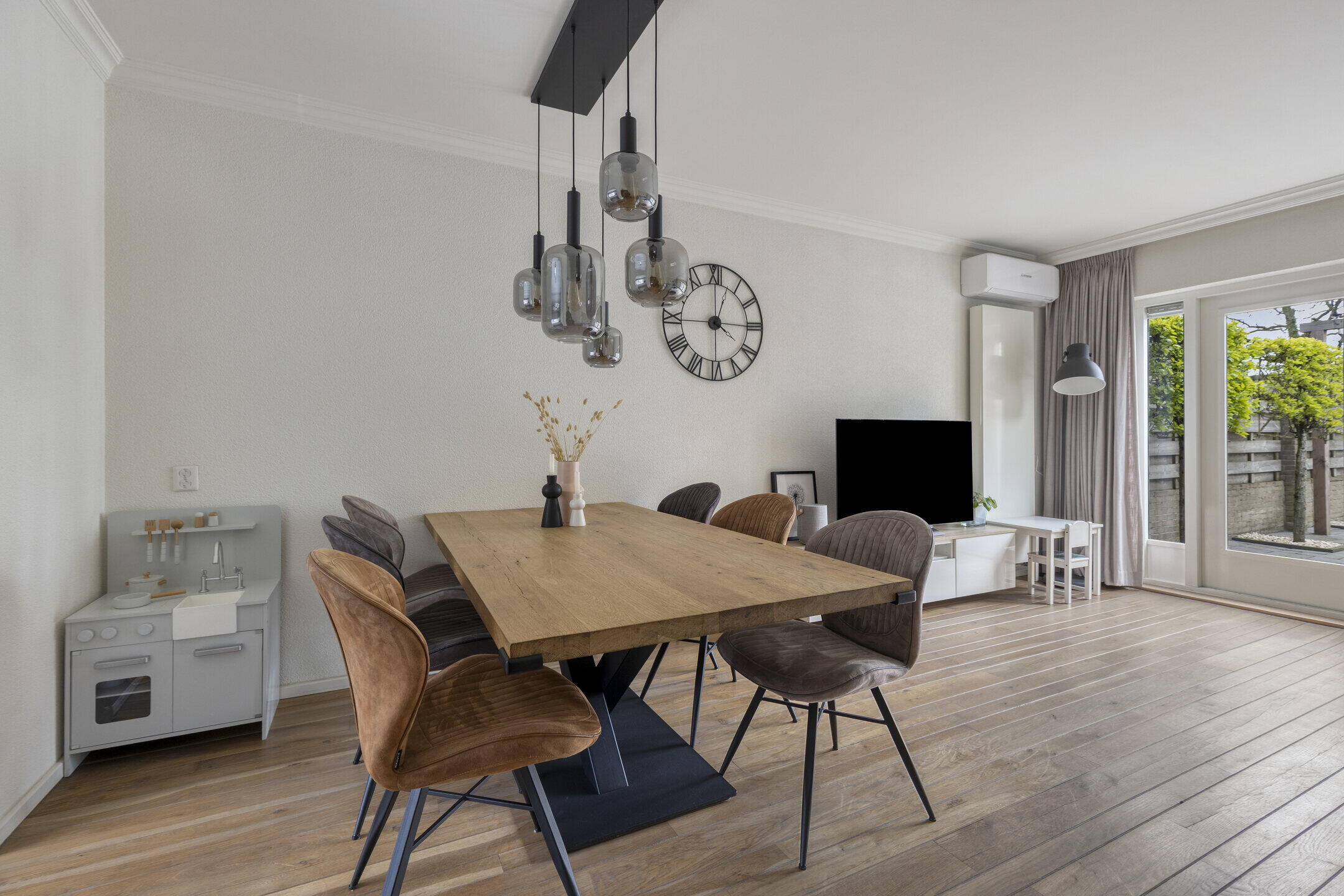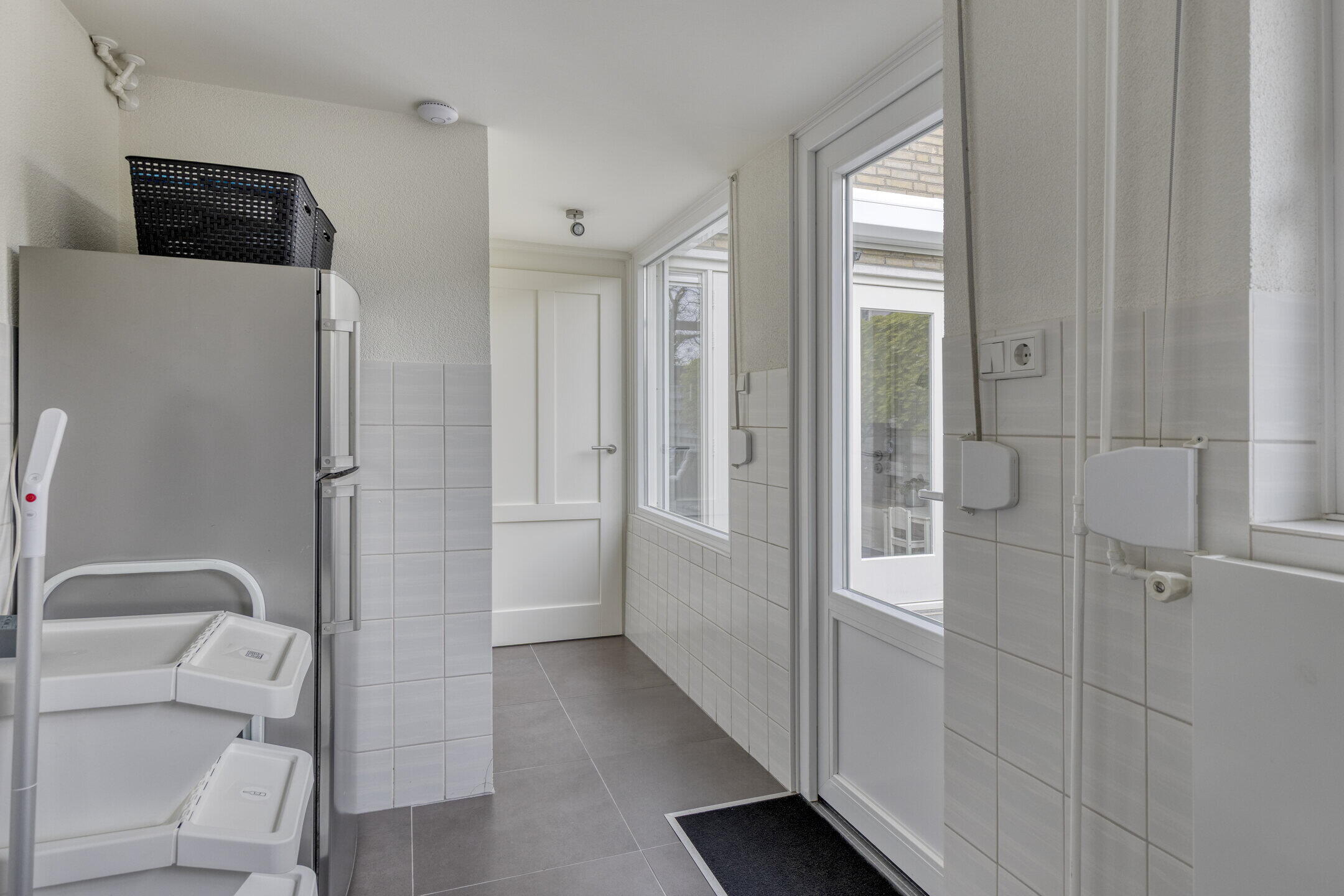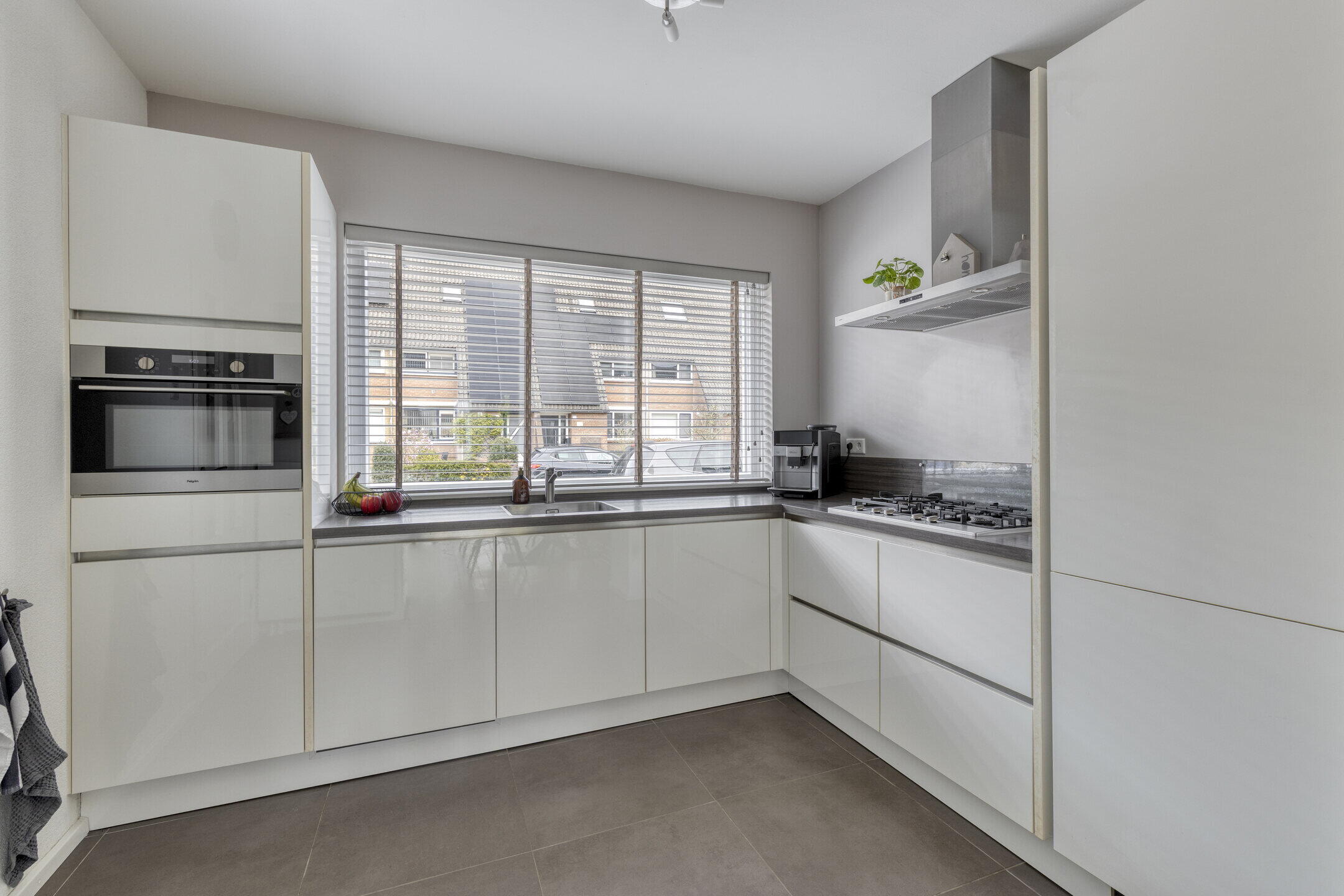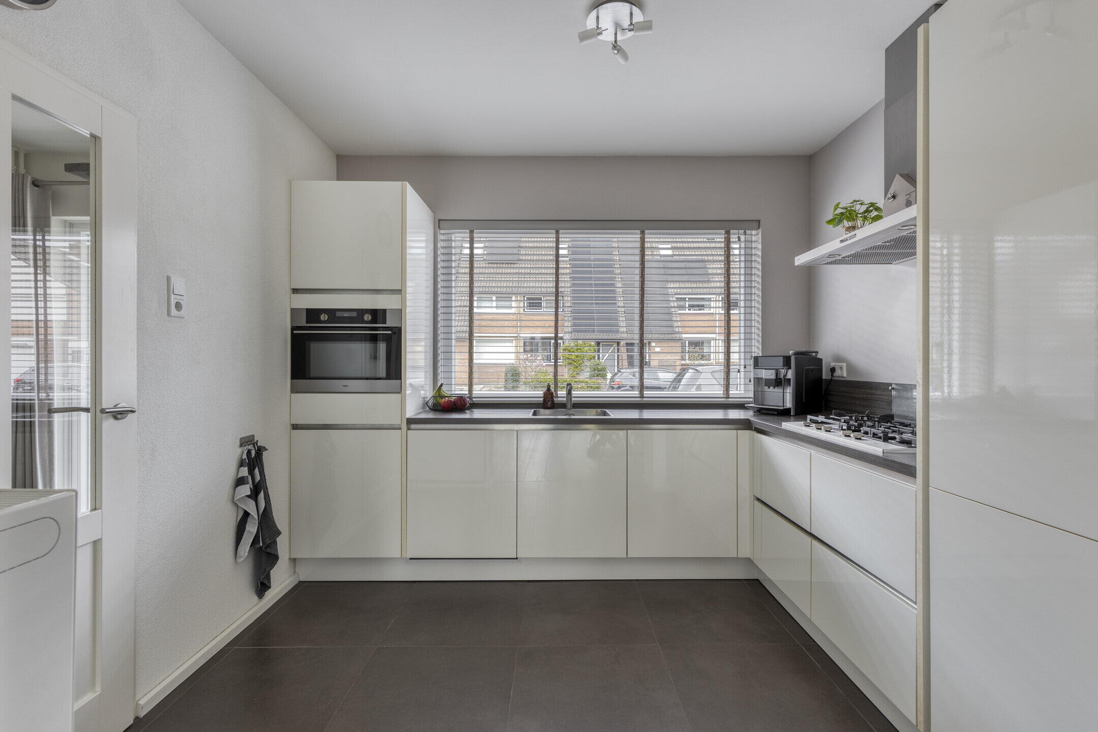 De ruime woonkamer voelt direct aangenaam aan dankzij de mooie vloer en lichte wanden. De aanwezige airco zorgt hier het hele jaar door voor een comfortabel binnenklimaat. Via de tuindeuren stap je zo de tuin in, waardoor binnen en buiten mooi in elkaar overlopen. Aansluitend vind je een praktische bijkeuken met was- en droogaansluiting en een toilet — ideaal voor het dagelijkse gemak. De strakke hoogglans keuken is voorzien van diverse inbouwapparatuur en biedt alles wat je nodig hebt om heerlijk te koken.