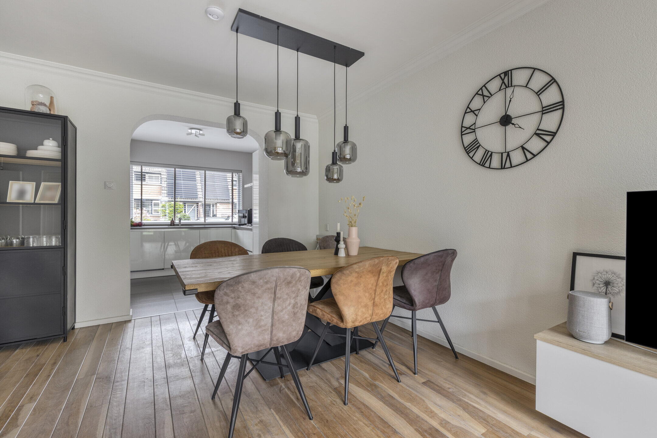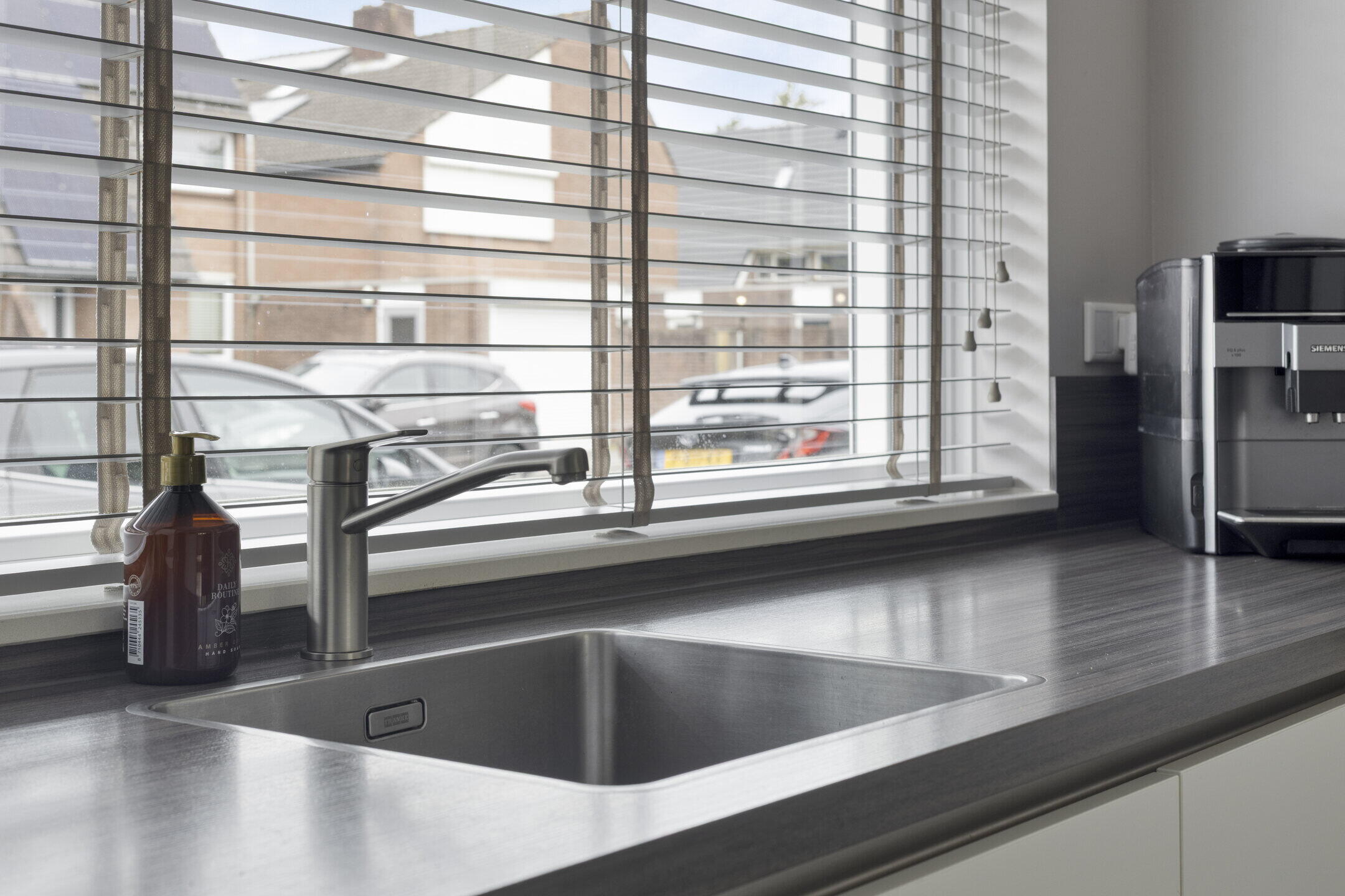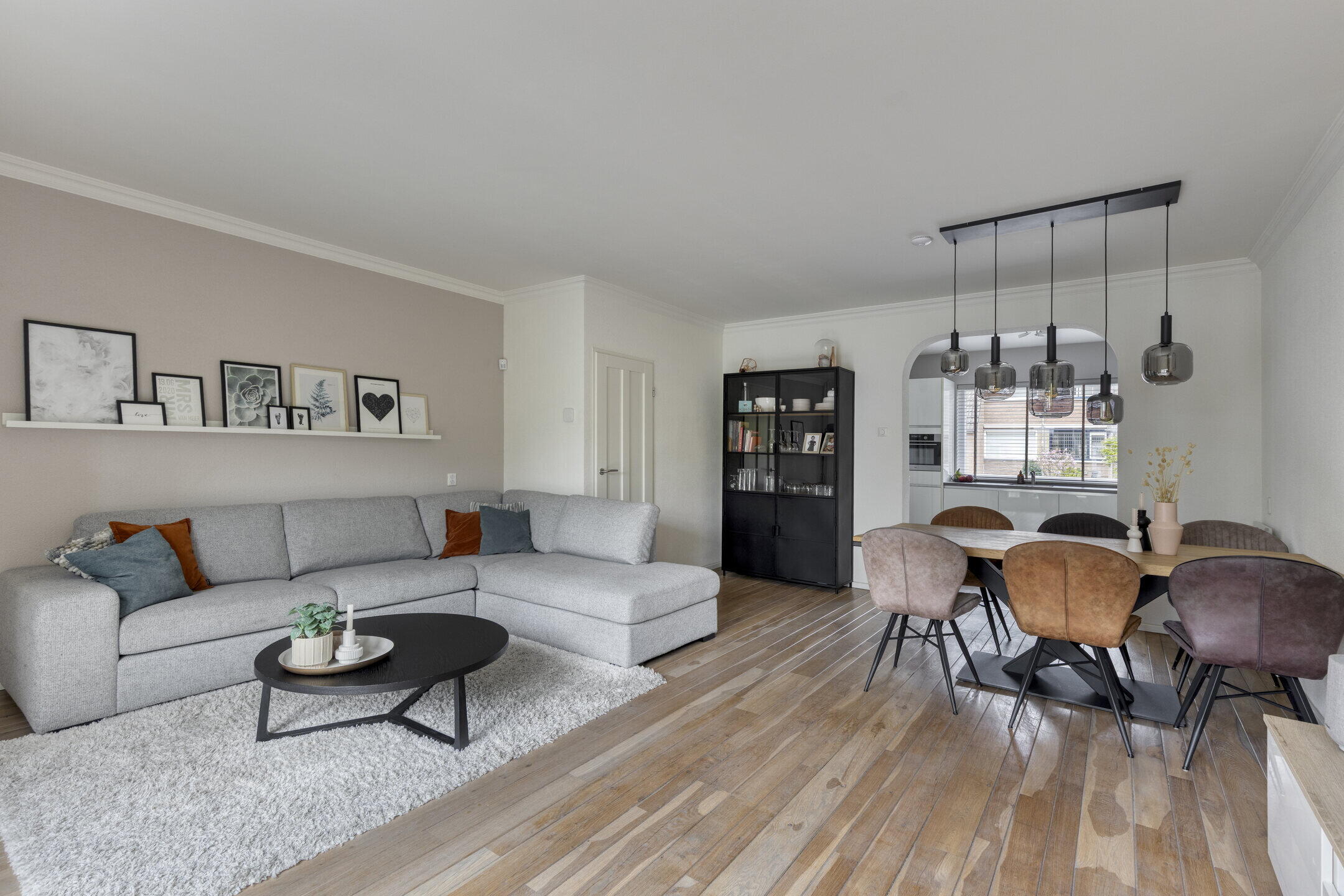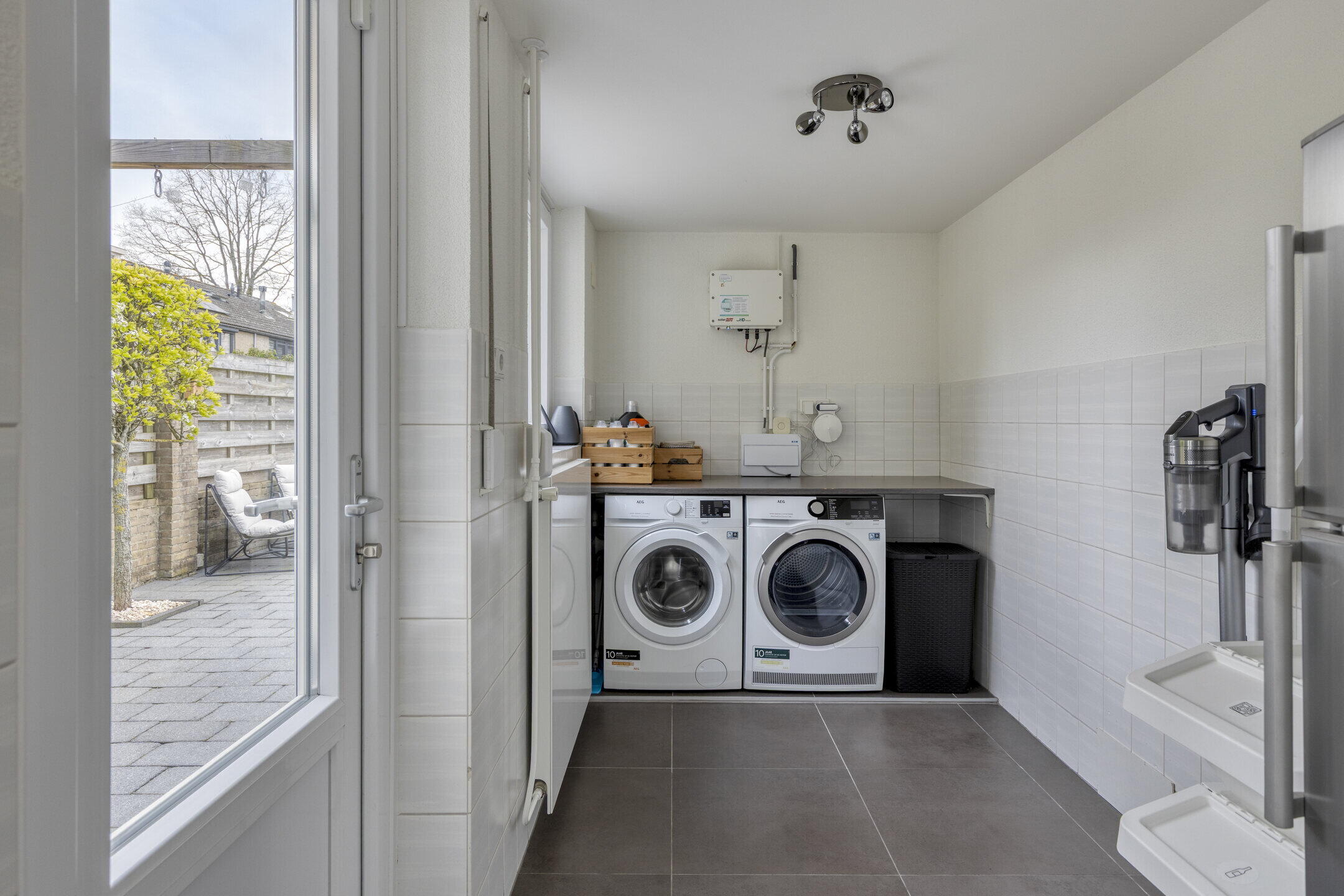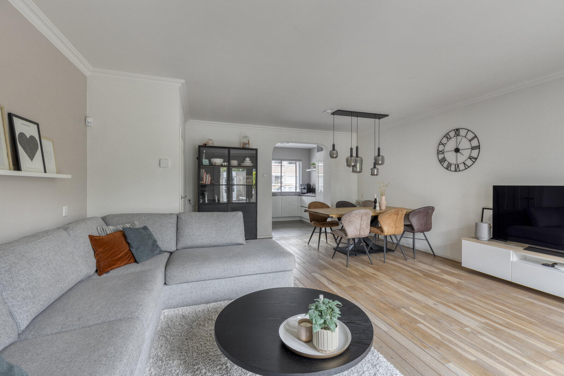 De ruime woonkamer voelt direct aangenaam aan dankzij de mooie vloer en lichte wanden. De aanwezige airco zorgt hier het hele jaar door voor een comfortabel binnenklimaat. Via de tuindeuren stap je zo de tuin in, waardoor binnen en buiten mooi in elkaar overlopen. Aansluitend vind je een praktische bijkeuken met was- en droogaansluiting en een toilet — ideaal voor het dagelijkse gemak. De strakke hoogglans keuken is voorzien van diverse inbouwapparatuur en biedt alles wat je nodig hebt om heerlijk te koken.